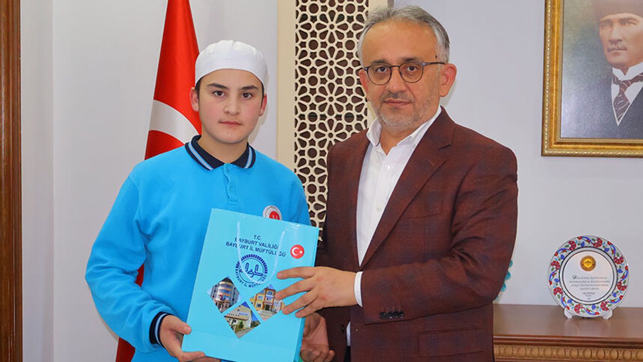 Hafız Mert Kaan Dursun’u Müftülük Makamında kabul eden İl Müftüsü Bayram Danacı, tebrik ederek hediye takdim etti.