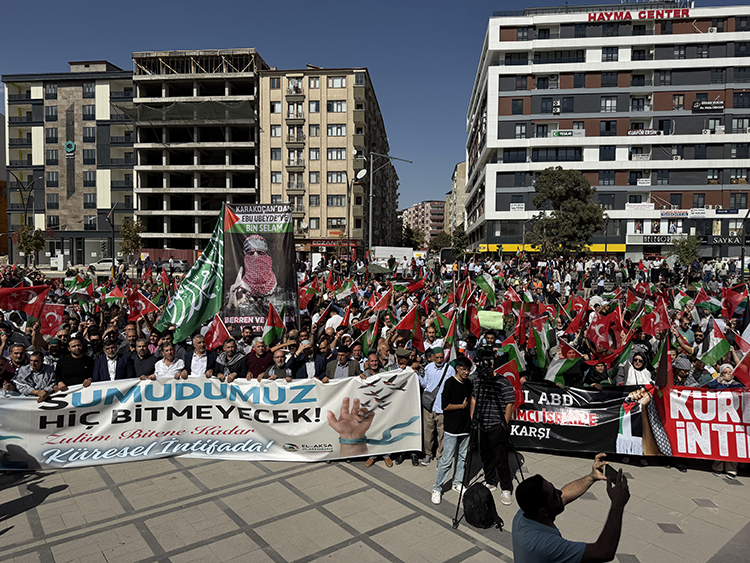 Türk ve Filistin bayraklarıyla İsrail aleyhine sloganlar atan kalabalık, “Şehitlerimiz ve Filistin için yürüyoruz”, “Bir adım ötede insanlık ölüyor, kahrolsun İsrail”, “Müslümanlar birleşin”, Filistin özgür olana kadar mücadelemiz devam edecek”, “Bir sabah gelecek kardan aydınlık” yazılı pankartlar taşıdı.