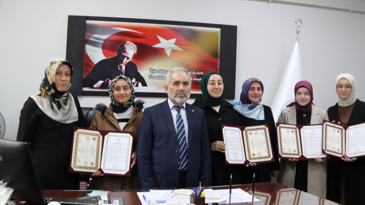 Çankırı İl Müftülüğüne bağlı olan Cemaleddin Ferruh Erkek, Bahçelievler Sultan Hatun Kız ve Çavuşoğlu Kız Kur’an kurslarında hafızlık eğitimi alan öğrenciler, Diyanet İşleri Başkanlığı Eğitim Hizmetleri Genel Müdürlüğü tarafından düzenlenen 2024 Yılı I. Dönem “Hafızlık Tespit Sınavı”nda başarılı olarak belge almaya hak kazandı. İl Müftüsü Mehmet Şahin, başarılı olan 10 hafıza belgelerini düzenlenen törenle takdim etti. Törende konuşan Müftü Şahin, “Siz hafız yavrularımızı özellikle tebrik ediyorum. Hafız sadece Kur’an-ı Kerimi’n kelimelerini, ayetlerini ezberleyen değil, aynı zamanda onun mânâsını kalbine ve ruhuna nakşeden, beynine alan ve gönül dünyasında seyreden bir insandır. Kur’an’ı içine sindirmiş olan gerçek hafız, yürüyen ve konuşan Kur’an demektir. Kur’an’ı beynine nakşeden ve kalbine yerleştiren hafızlar, hem dünyada şerefli ve saygın insanlardır, hem de ahirette akrabalarına ve yakınlarına şefaatçi olacaklardır. Bu müjdeyi Efendimiz (sas) şu sözleriyle verirler: ‘Kim Kur’an okur ve onu ezberler, helalini helal kılar ve haramını haram kılarsa, Allah, bu Kur’an sebebiyle onu cennetine koyar ve ailesinden cehenneme girmeyi hak eden on kişiye şefaat hakkı tanır.’ Hafızları Abese Sûresinde sözü edilen sefere-i kirama benzeten Peygamber Efendimiz (sas), hafızların cennette onlarla beraber olacağını müjdelemiştir. İşte sizler bu müjdelere ve nimete nail olmuşsunuz. Bu yolda emek veren öğreticilerimize de şükranlarımı sunuyorum. Başarılarınızın daim olmasını yüce rabbimden niyaz ederim.” dedi.