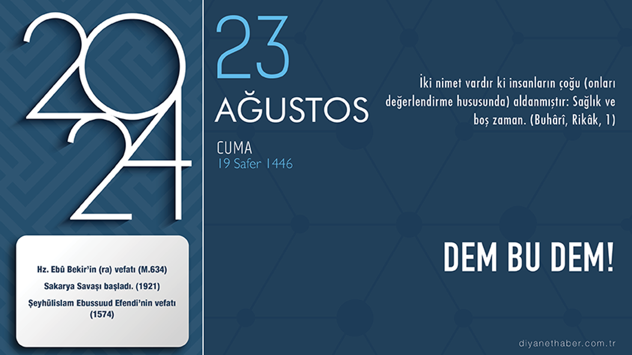 Dem bu dem! Yüce Rabbimiz, insanın en kıymetli sermayesi olan ömrü kimi kullarına uzun kimisine de kısa takdir etmiştir. Her sabah doğan güneşle yeni bir güne uyanır insan. Her yeni gün de esasında insana verilen yeni bir fırsattır. Geçip giden dünlerde ve geleceği meçhul yarınlarda oyalanmadan yeni gelen günü nimet bilerek uyanmalı sabaha. Rabbe şükrederek zaman nimetinin kadrini eda ederek günü bereketlendirmeli. Rabbin rızasına muvafık işler yapmaya niyet ederek ‘bismillah’ deyip başlamalı. Çünkü her günün akşamı, insanın biten ömrü gibi bir bitiş ve her yeni gün yeni bir doğuştur. Alıp verdiği her nefesle ömür sermayesini tüketiyor insan. Çoğumuz farkında bile değiliz her nefesin bizi mutlak sona biraz daha yaklaştırdığının. O hiç bitmeyecekmiş gibi gelen zaman değirmeninin her anı usulca öğüttüğünü fark etmeli insan. Dem bu dem, gün bugün, saat bu saattir. Öncesi ve sonrası yok. Sadece içinde yaşadığımız bugün, bu an var. İbnü’l-vakt olup anın hakkını vererek yaşamak. — “Hz. Ebû Bekir’in (ra) vefatı (M.634) Sakarya Savaşı başladı. (1921) Şeyhülislam Ebussuud Efendi’nin vefatı (1574)”