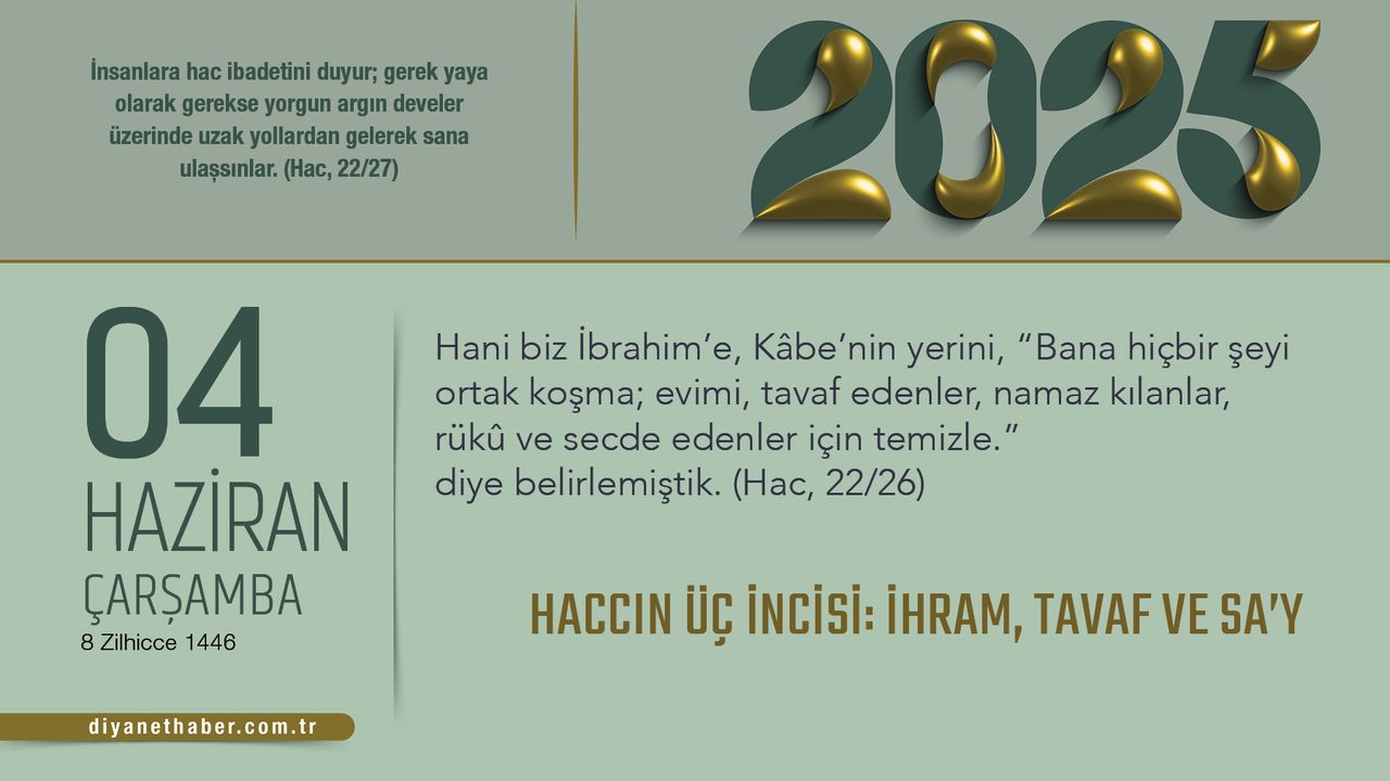Haccın Üç İncisi: İhram, Tavaf ve Sa’y İhram, haccın üç farzından biridir. Diğer ikisi Arafat vakfesi ve ziyaret tavafıdır. İhram, aslında helal olan söz, fiil ve davranışların bir kısmının belli bir süre için haram kılınması anlamına gelir. Bu yasaklar mikat mahallinde niyet edip telbiye getirmekle başlar ve ihramdan çıkıncaya kadar devam eder. Niyet etmek ve telbiye getirmek suretiyle ihrama girilmiş olur. Tavaf ise Hacerülesved’in hizasından başlayarak Kâbe’nin etrafında yedi kere dönmeye denir. Her bir dönüş “şavt” olarak isimlendirilir. Tavaf yapacak kimse abdestli olmalı ve gücü yettiğince tavafı yürüyerek yapmalıdır. Tavafa niyet ederek başlanır ve Hacerülesved’in hizasına gelmeden önce niyetin yapılması gerekir. Hacerülesved tavafa başlama noktasını gösteren bir taştır. Sa’y, hac veya umre için yapılan bir tavaftan sonra Safa ve Merve tepeleri arasında yapılan yürüyüştür. Kur’an’ın ifadesiyle Safa ve Merve “şeâirullah/Allah’ın nişaneleri” (Bakara, 2/158) yani İslam dininde kutsal kabul edilen sembollerdir. Bir Ayet: “İnsanlara hac ibadetini duyur; gerek yaya olarak gerekse yorgun argın develer üzerinde uzak yollardan gelerek sana ulaşsınlar.” (Hac, 22/27) Bu gönderiyi Instagram'da gör Diyanet Takvimi (@takvim.diyanet)'in paylaştığı bir gönderi