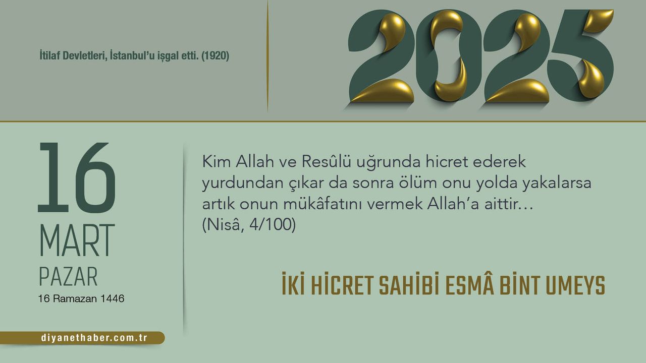 İki Hicret Sahibi Esmâ Bint Umeys Esmâ bint Umeys, Mekke’de Allah Resûlü’ne inanan bir avuç kişiden biriydi. Hz. Peygamber’in emri doğrultusunda eşi Cafer b. Ebû Tâlib’le birlikte Habeşistan diyarına hicret etti. Habeş memleketinde, çok sevdiği peygamberinin ve Müslüman kardeşlerinin yıllarca hasretini çekti. Gün geldi, Habeşistan muhacirleriyle Medine muhacirlerinin yolu Peygamber şehri Medine’de kesişti. Esmâ, sevgili eşiyle birlikte Hayber’in fethi esnasında, ikinci hicretini Medine’ye gerçekleştirdi. Böylece o, Allah yolunda iki defa hicret etme saadetine erdi. Onun için en büyük hüzünlerden biri eşi Hz. Cafer’i Mute Savaşı’nda yitirmesiydi. Hz. Cafer’in ardından yetimlerini Hz. Peygamber himaye etti. Esmâ bint Umeys, asırlar ötesine imanıyla, cesaretiyle, sabır ve metanetiyle örnek oldu. Peygamberine duyduğu muhabbeti, ona ve onun sözlerine olan bağlılığı ile gösterdi. Ve onun mübarek sözlerinden altmış kadarı, Esmâ’nın ağzından satırlara, satırlardan sadırlara, zamanlardan zamanlara hep nakledilegeldi. İtilaf Devletleri, İstanbul’u işgal etti. (1920) Bu gönderiyi Instagram'da gör Diyanet Takvimi (@takvim.diyanet)'in paylaştığı bir gönderi
