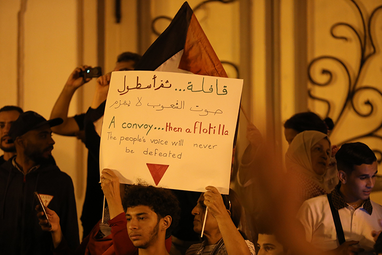 Mağrib Sumud Kafilesi’nin çağrısıyla başkent Tunus’un merkezinde yer alan Habib Burgiba Caddesi’nde toplanan göstericiler, İsrail’in Küresel Sumud Filosuna saldırısını protesto etti.