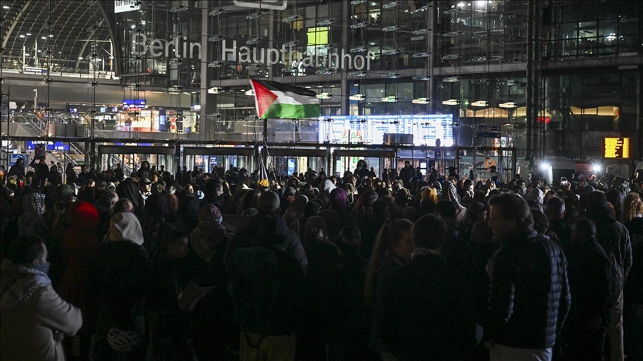 Berlin ana tren istasyonunda toplanan yaklaşık 300 kişi, Küresel Sumud Filosu ile dayanışma mesajları verdi.